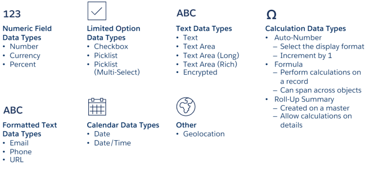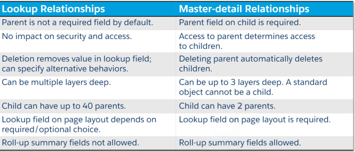 - Lookup and master-detail relationships, fields and relationships for standard and custom objects, field values, and necessary fields are all visible.